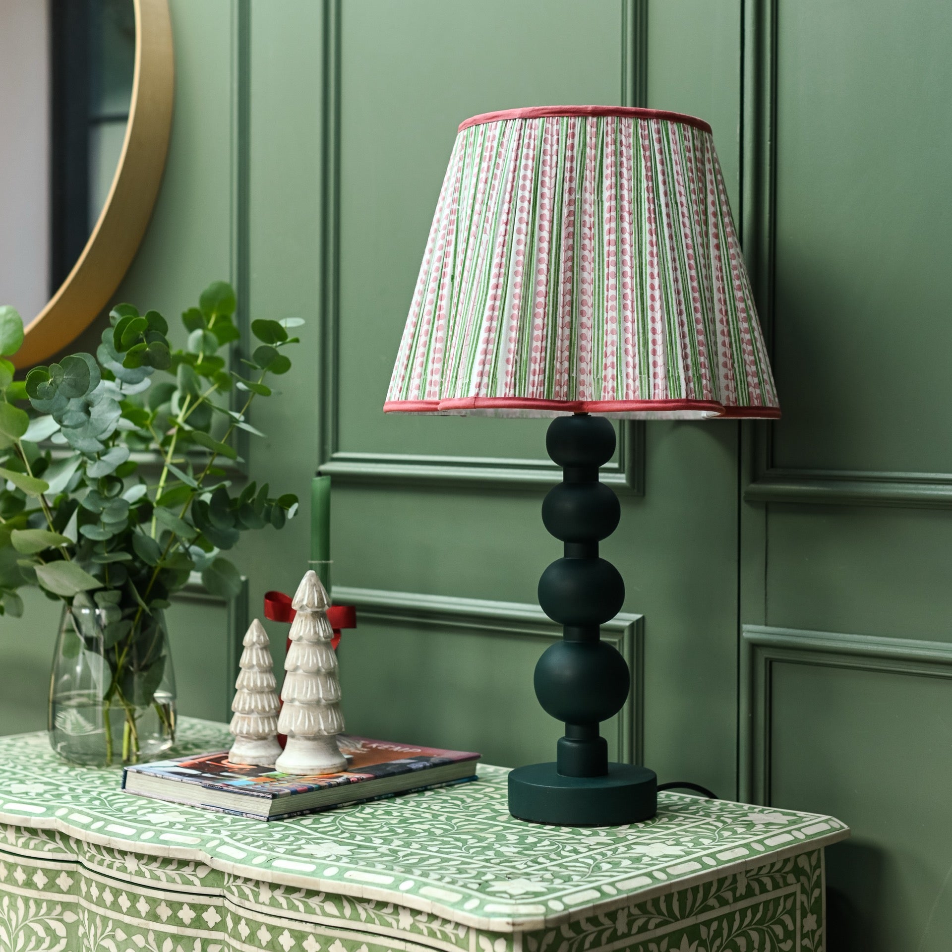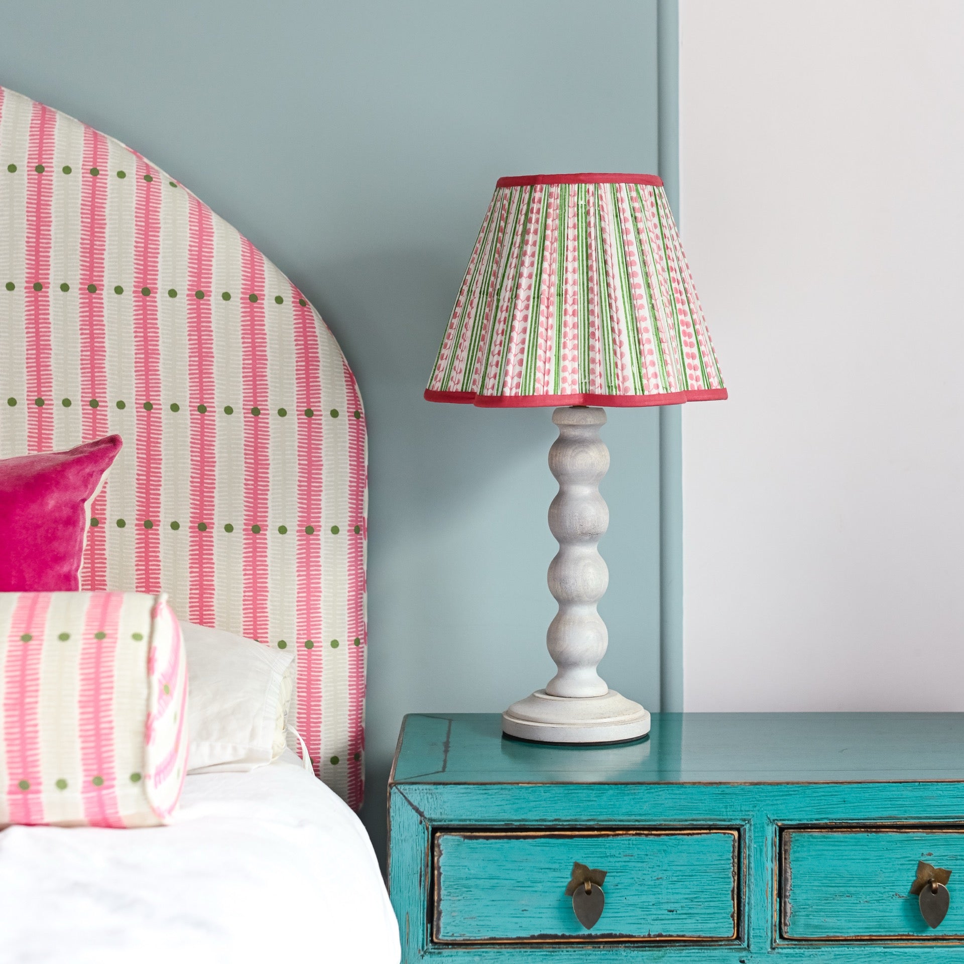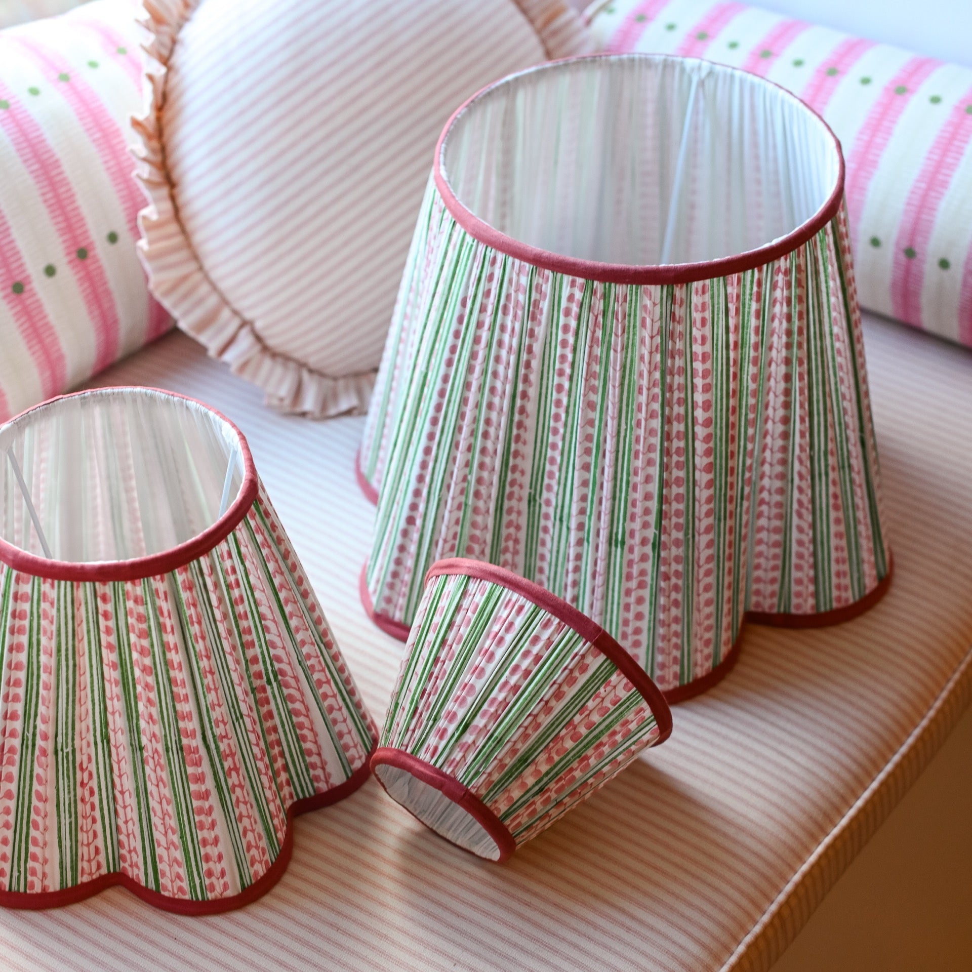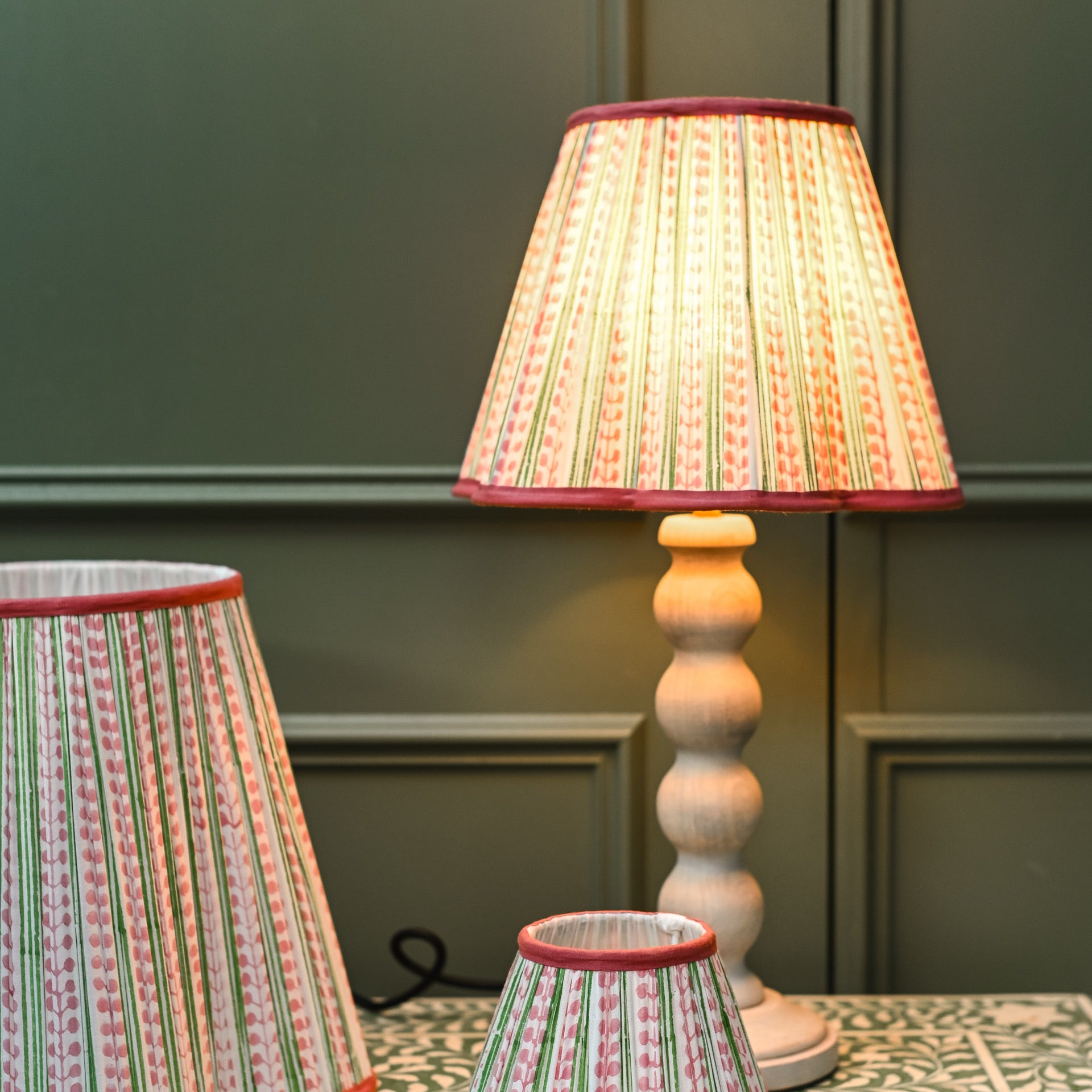 This soft and playful block printed lampshade is designed with green stripes and pink flower buds. Made in India by hand and printed on a rich cotton finished off with a dark pink trim.