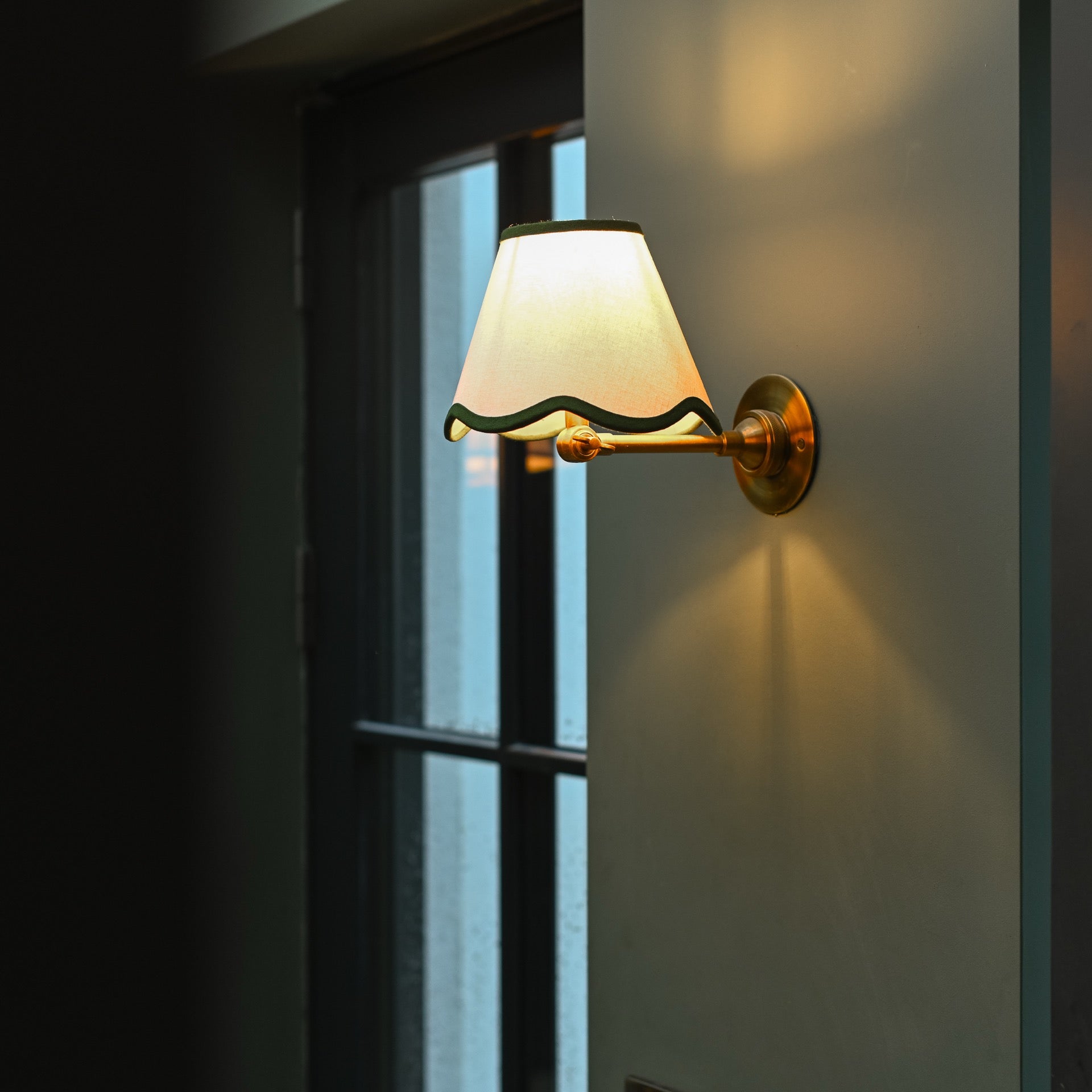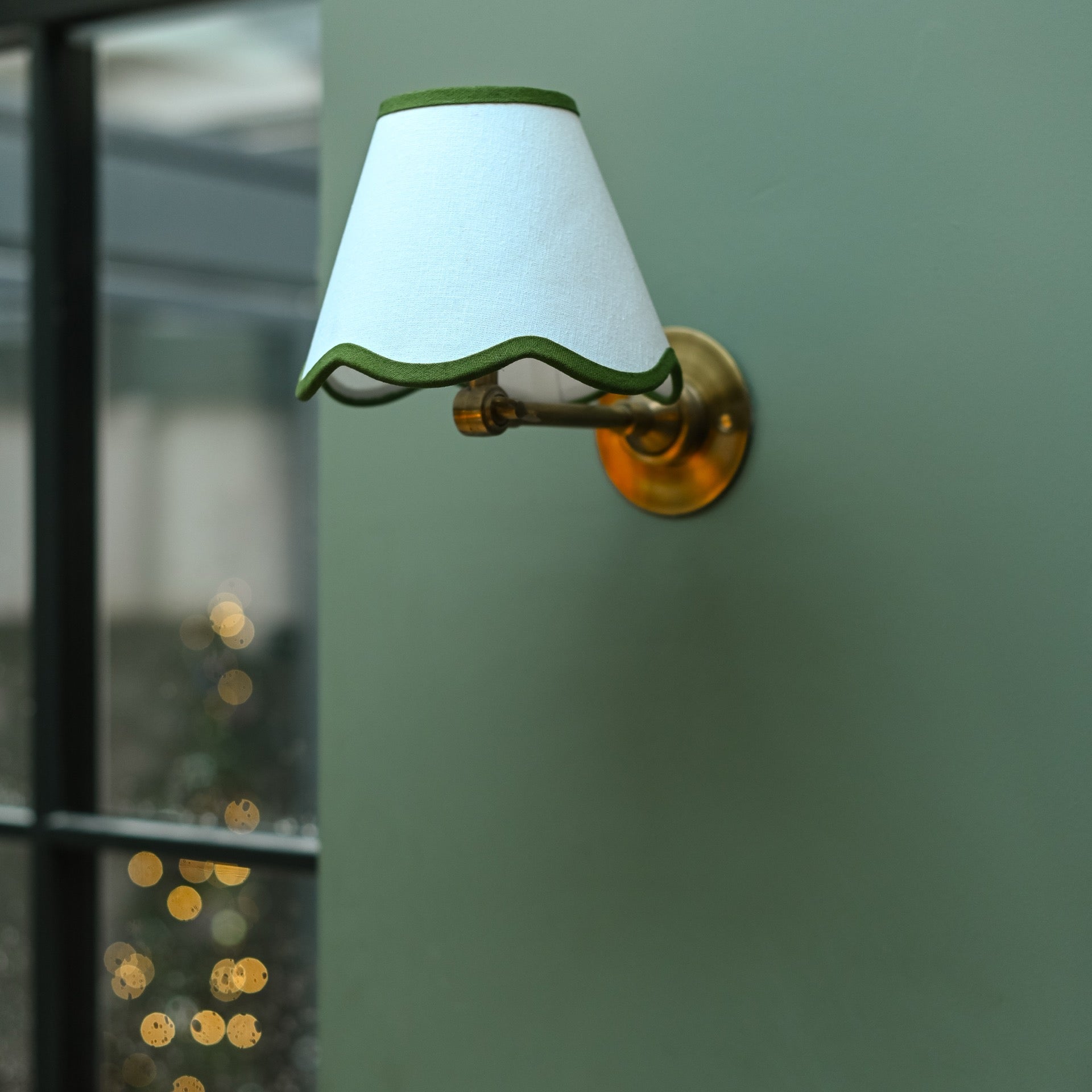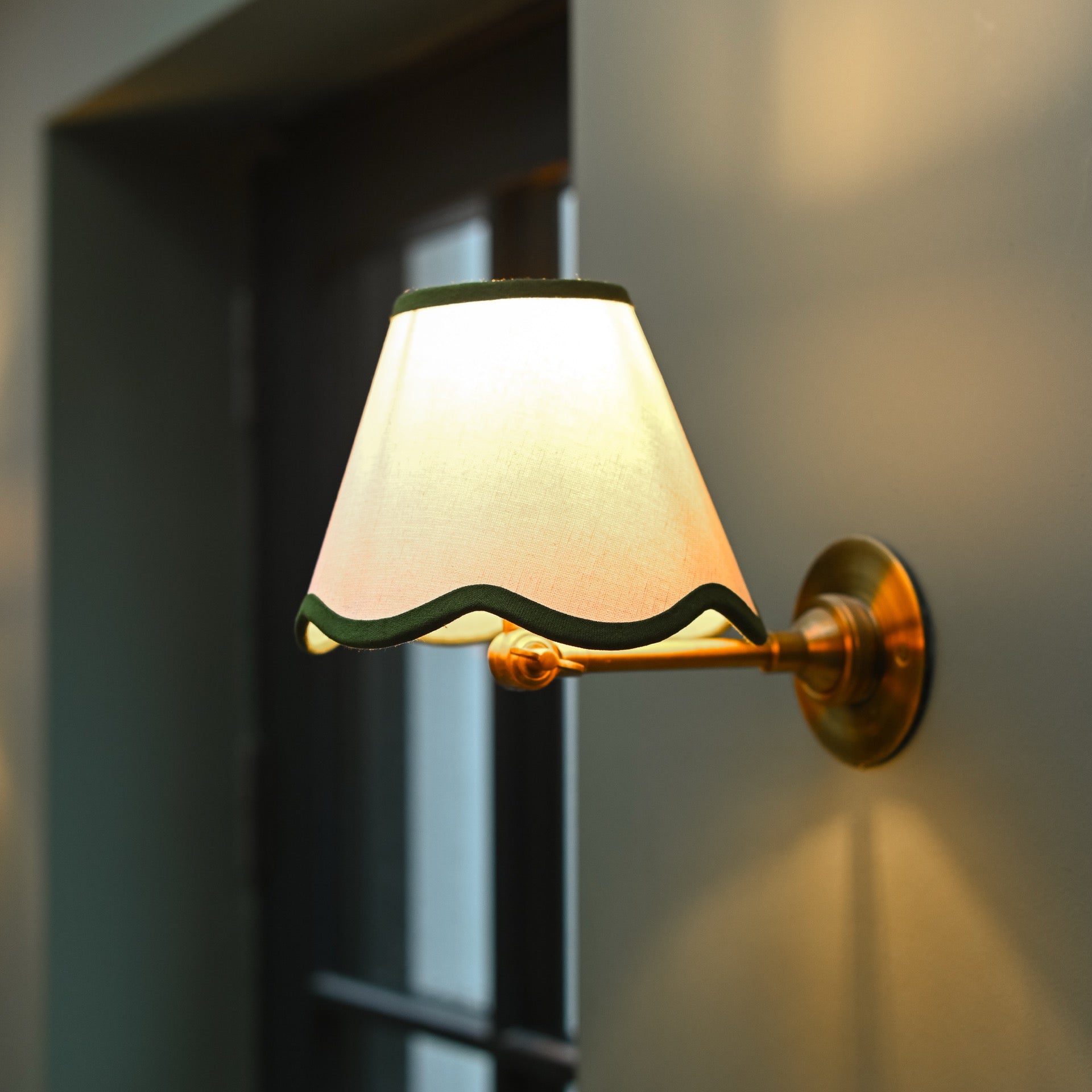 Back by popular demand, but with a slightly different richer olive green trim and a slightly smaller size. A stunning empire drum shape lampshade with a flared contemporary scalloped bottom edge.