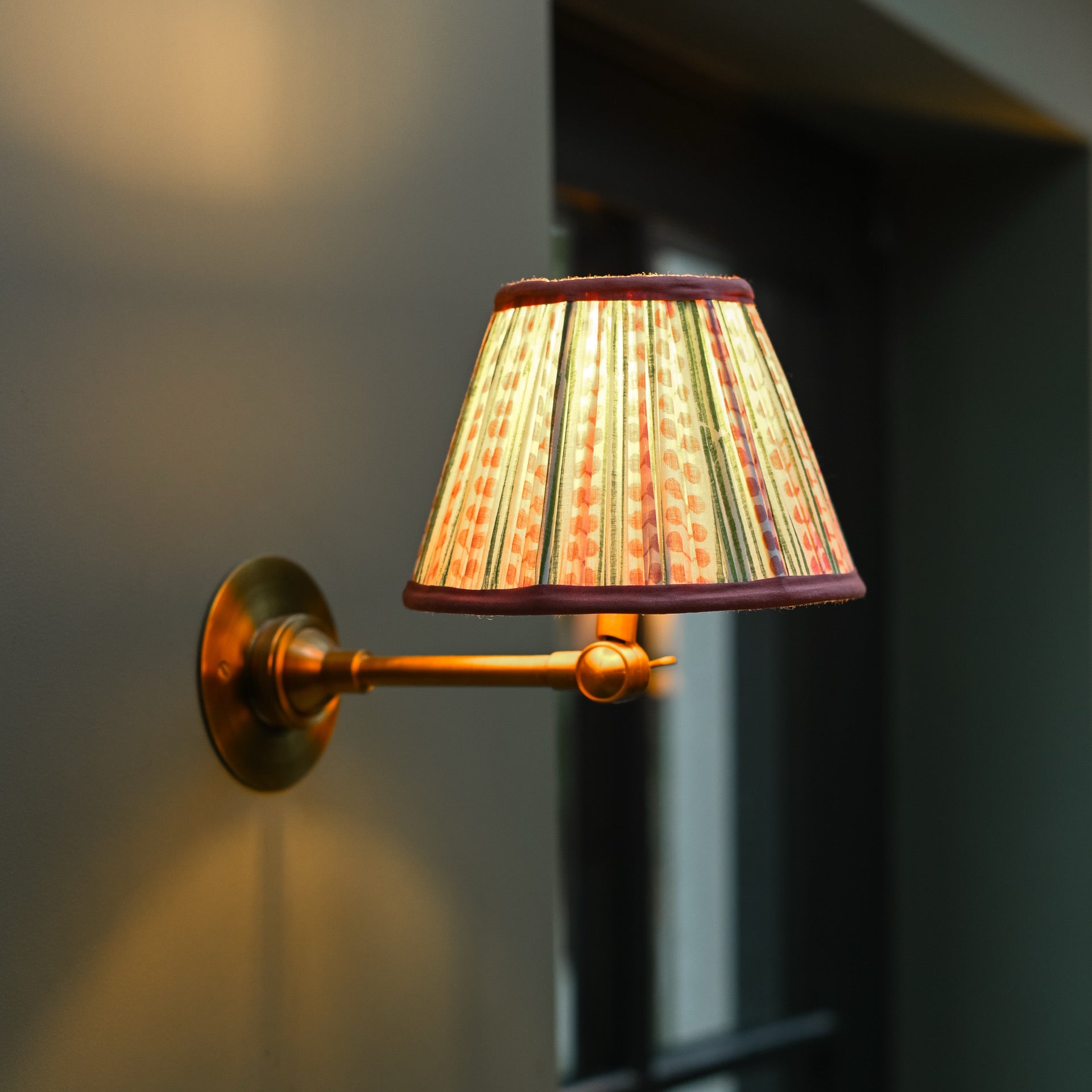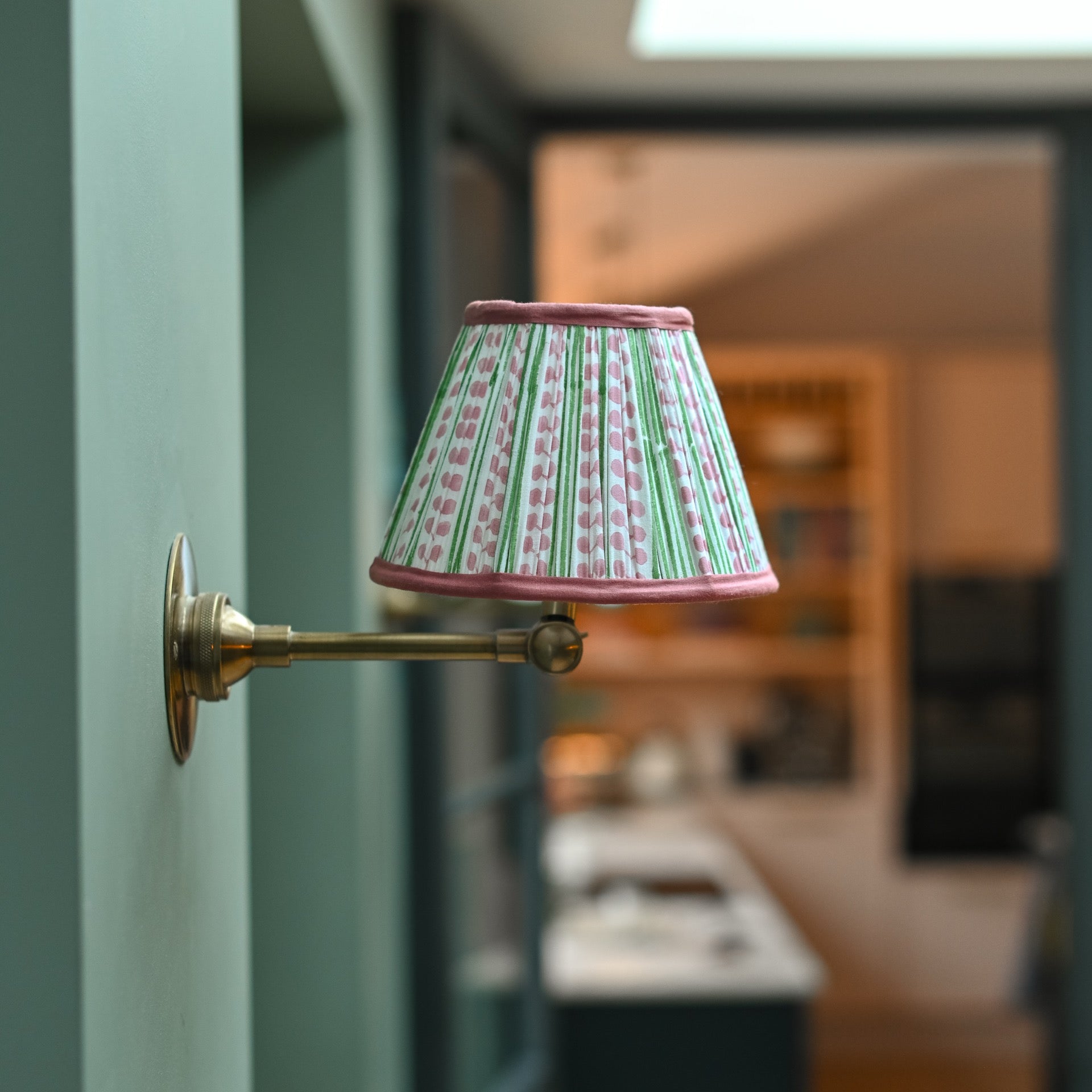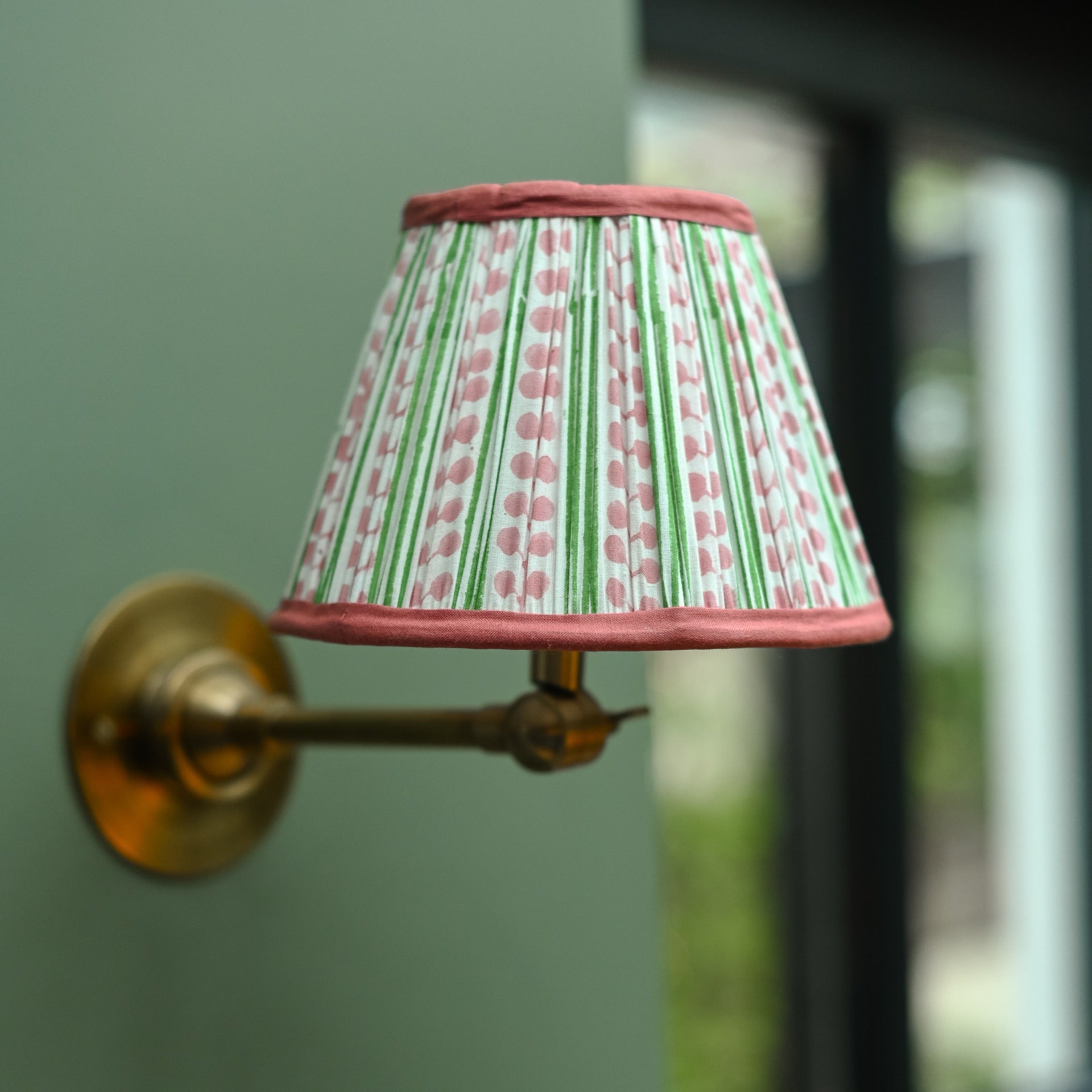 This soft and playful block printed lampshade is made up of green stripes and pink flower buds. Made in India by hand and printed on a rich cotton finished off with a dark pink trim. This mini 18cm size is ideal for wall light fittings and chandelier lights.
