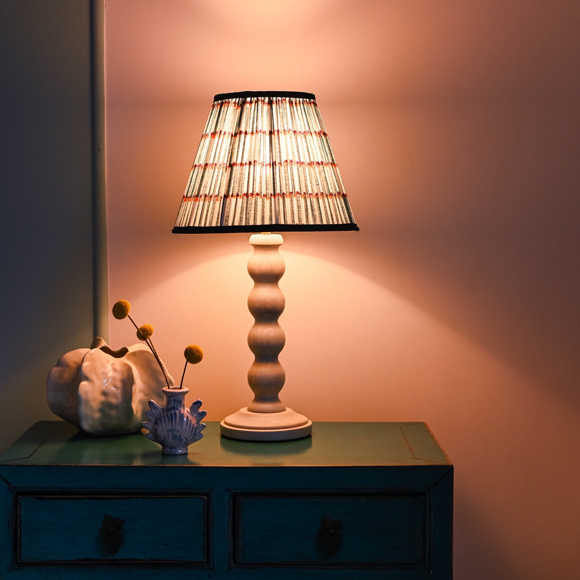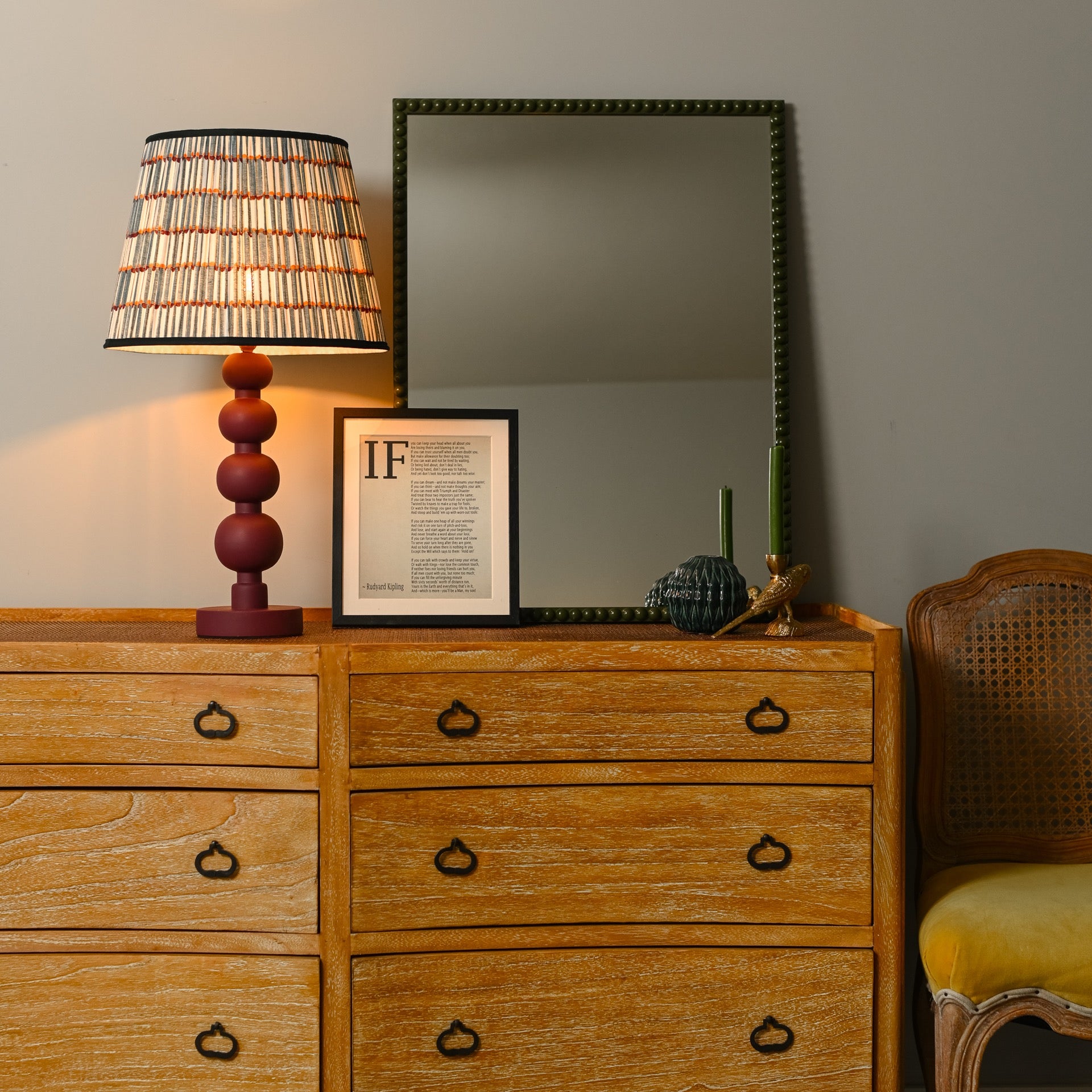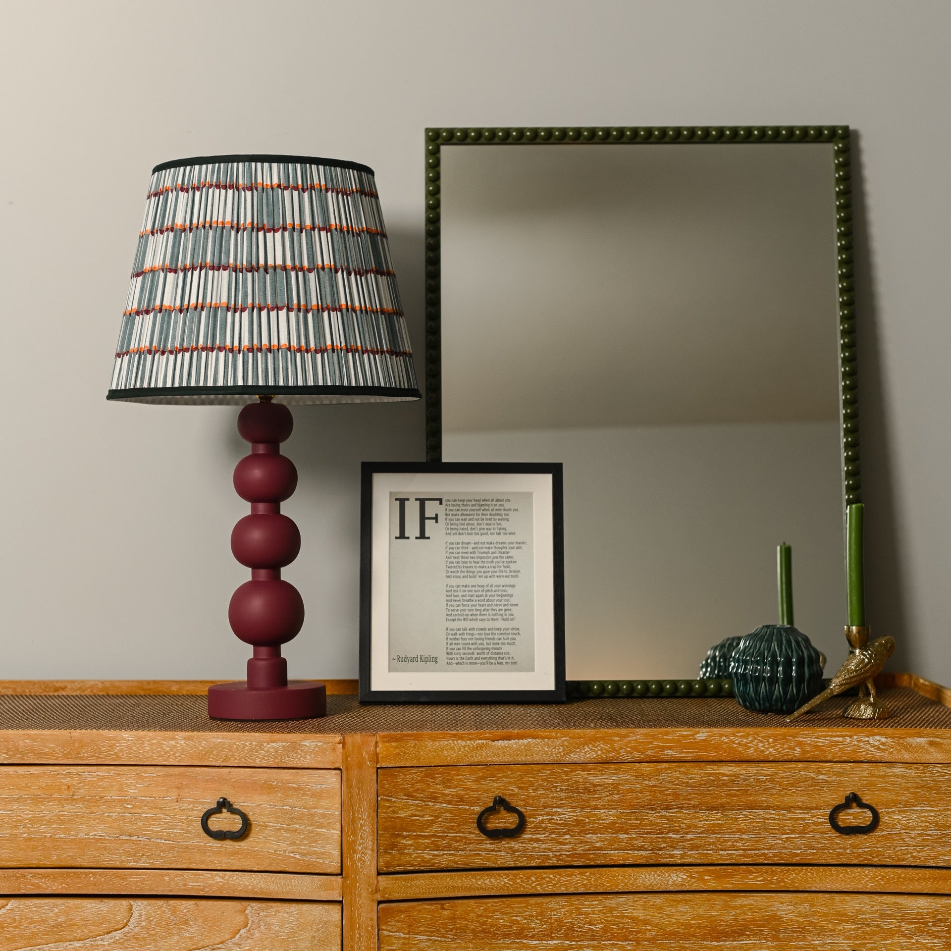 A unique hand-printed lampshade with stripes of green & white coupled with orange and burgundy dots on 100% cotton fabric and finished with a dark green trim.