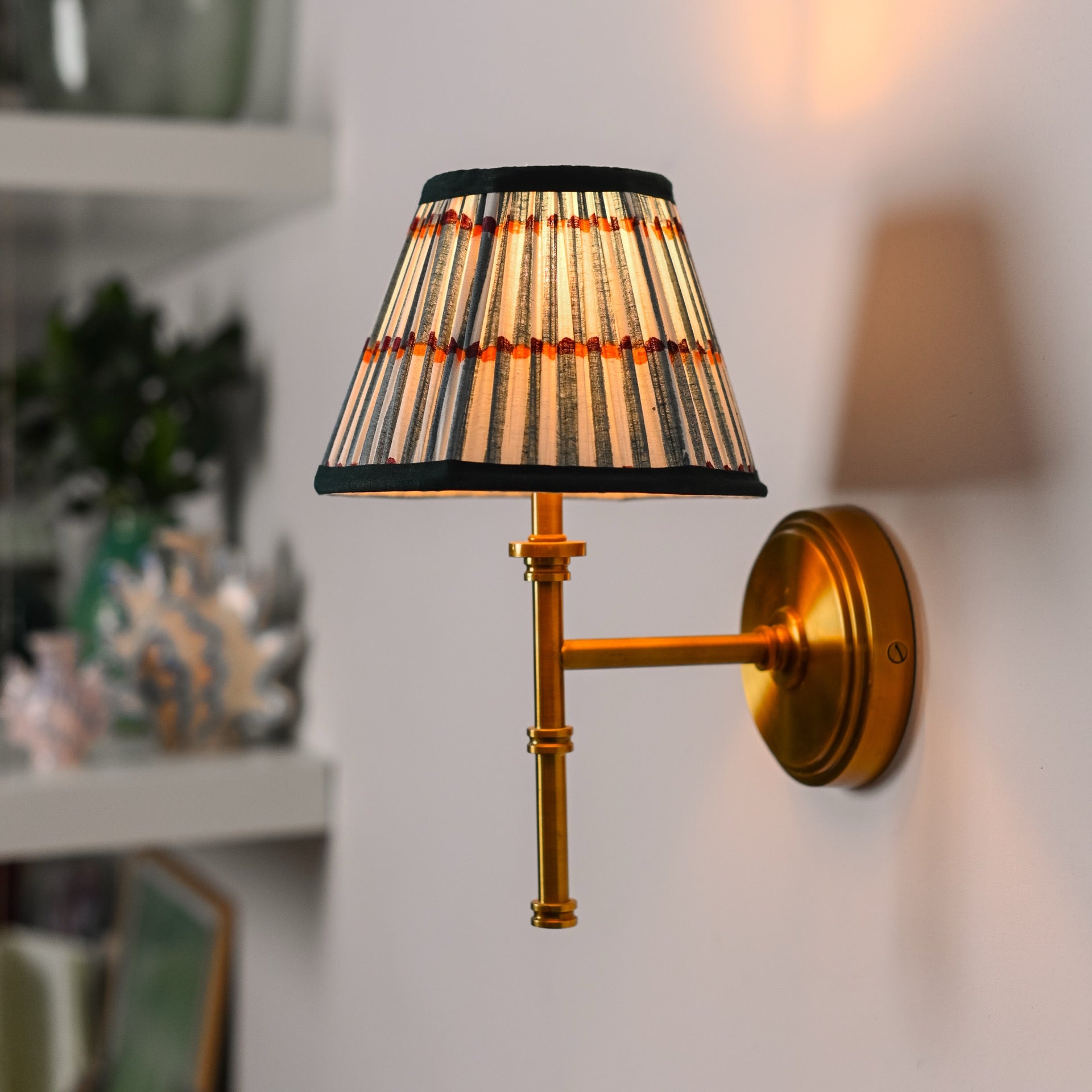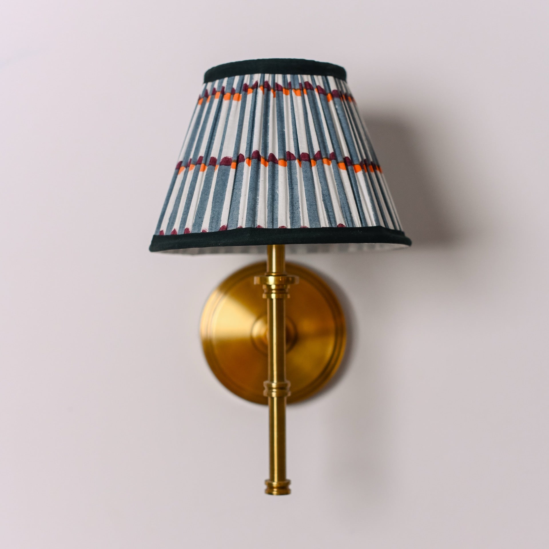 A unique hand-printed lampshade with stripes of green & white coupled with orange and burgundy dots on 100% cotton fabric and finished with a dark green trim.